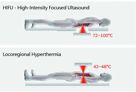 - 高強度聚焦超聲(HIFU-High-Intensity Focused Ultrasound)-通過聲能將癌細胞內的目標溫度提高到72°C以上,進而讓癌細胞壞死。