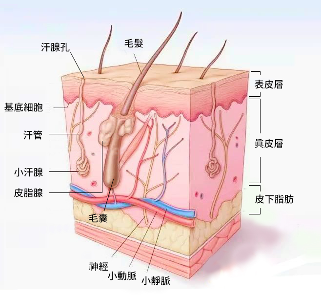 皮膚有兩種腺體:「汗腺」,「皮脂腺」