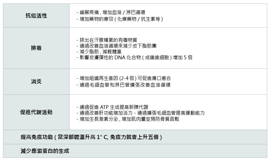 - -遠紅外線 : 促進血液循環、減緩痠痛、增加代謝