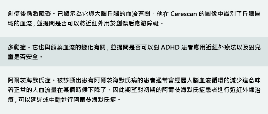 2)近紅外線的原理適用於現代人的癌症 , 代謝性疾病 , 血管疾病和 神經退行性疾病的治療
